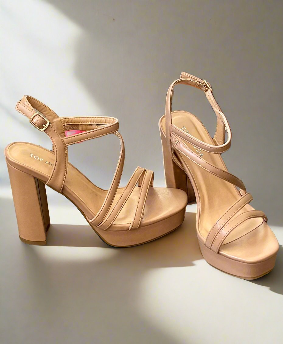 The Aurora Heels, with a 4 inch heel and platform, will elevate any outfit. Its light weight design and adjustable ankle strap provide foot support, while the all over strap detail adds a stylish touch.